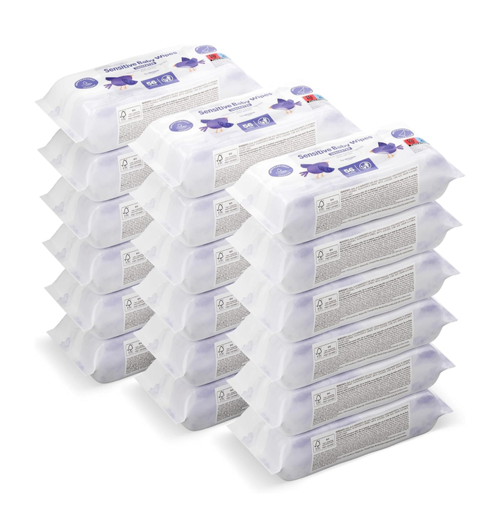 By Amazon Sensitive Baby Wipes - previously a Mama Bear brand. Formulated with mild and gentle ingredients and hypoallergenic for baby's delicate skin. Suitable for hands, feet and nappy area. Dermatologically approved. Delivered in a case containing 18 packs, with 56 wipes in each pack making a total of 1,008 wipes.